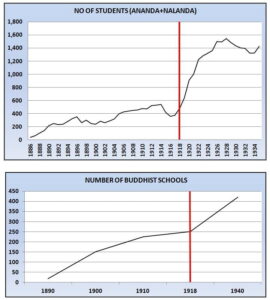 However, the student population in 1917 was still only 400. The school had levied fees from the beginning and received government grants but adequate funding had been a perennial problem. Also, the supply of educated Ceylonese willing to become teachers at a relatively small school like Ananda was limited. More importantly, many Buddhists were quite obviously reluctant to entrust their children to Ananda, preferring established missionary schools.